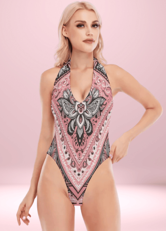 Ornate Pink Bandana Backless V-neck Skinny Bodysuit
