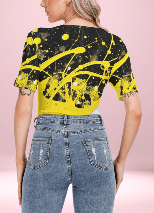 Splatter Chic Yellow and Black Women's Short Sleeve Bodysuit